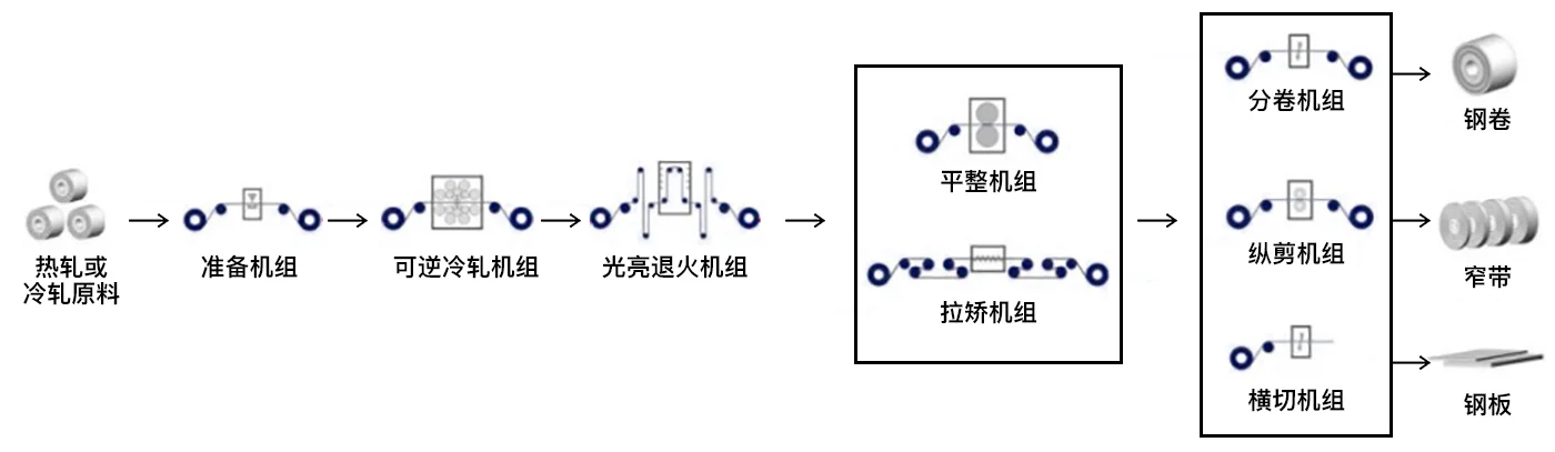 此工艺流程将热轧或冷轧不锈钢原材料在常温条件下经高精度、可逆式多辊冷轧机组轧制目标厚度,并经光亮热处理达到客户要求的表面效果和机械性能,再经平整或拉矫工序对不锈钢板带的表面及板形进行优化处理,并改善产品的力学性能达到精密冷轧不锈钢板带所需机械性能,此工艺流程生产的精密冷轧不锈钢板带在机械性能方面属于软态。